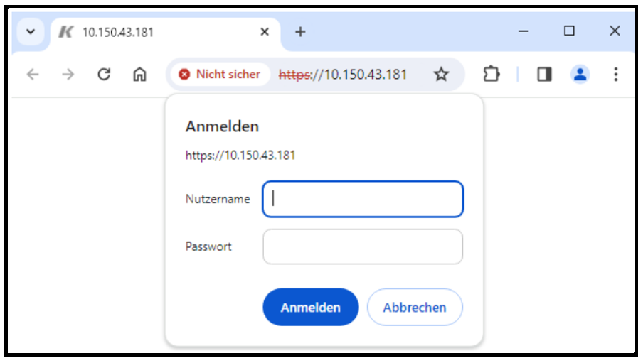Da es sich um ein Self-Signed Zertifikat handelt, bei dem der Browser keinen Drittanbieter zum Überprüfen hat, ist es eine einmalige Ausnahme für das Hinzuzufügen. Die nachfolgenden Abbildungen sind abhängig vom verwendeten Internetbrowser: