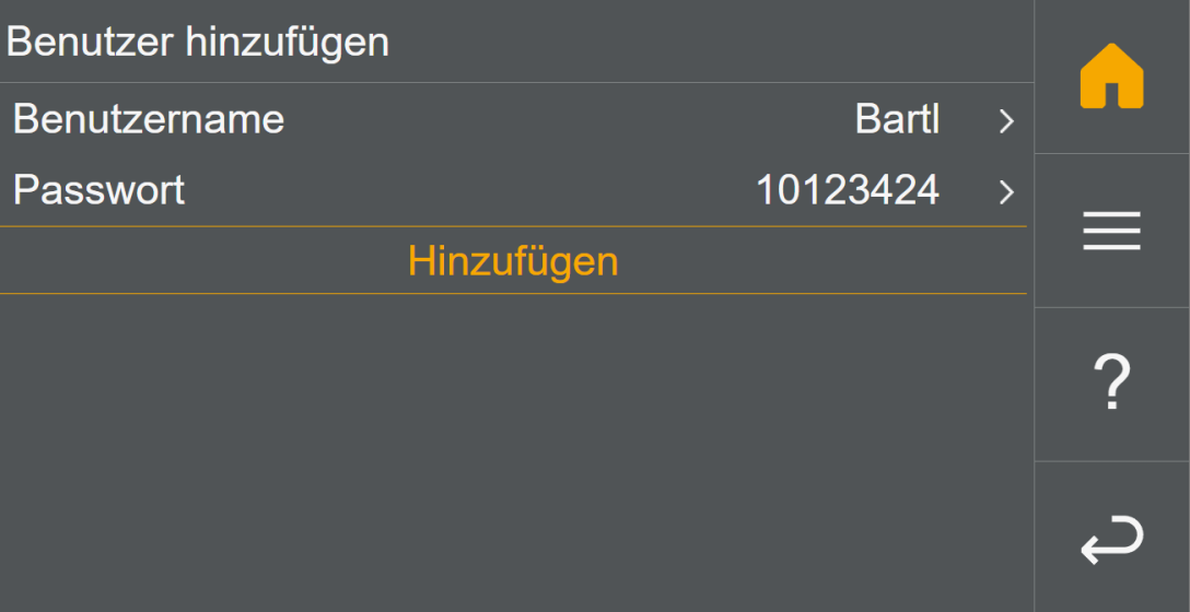 Mit „Benutzer hinzufügen“ kann ein oder mehrere Benutzer anlegt werden, indem jeweils ein frei wählbarer Benutzername und ein frei wählbares Passwort eingetragen wird. Für beide Eingabefelder wird empfohlen weniger als 50 Zeichen zu verwenden.